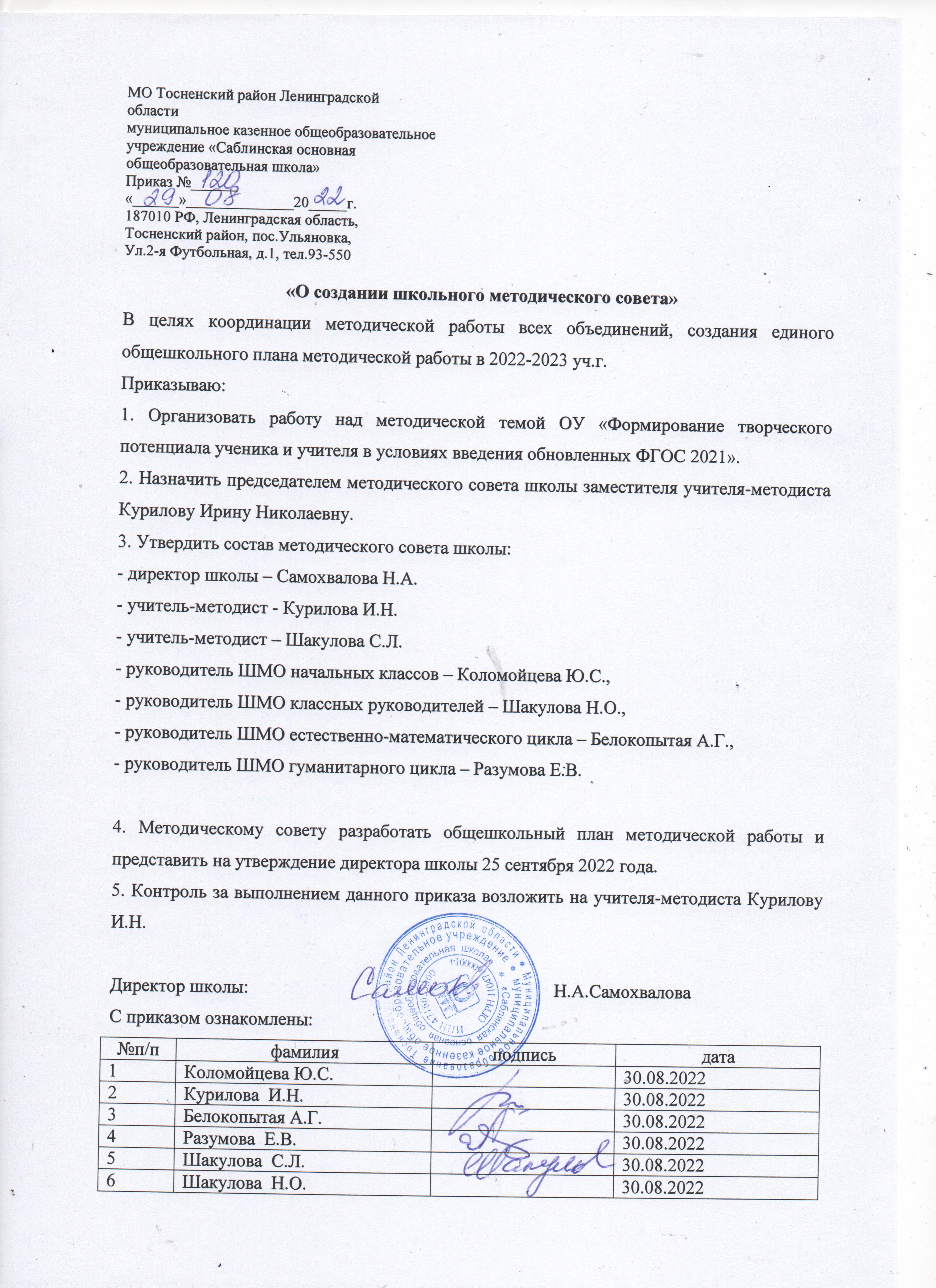 Приказ о создании школьного методического совета